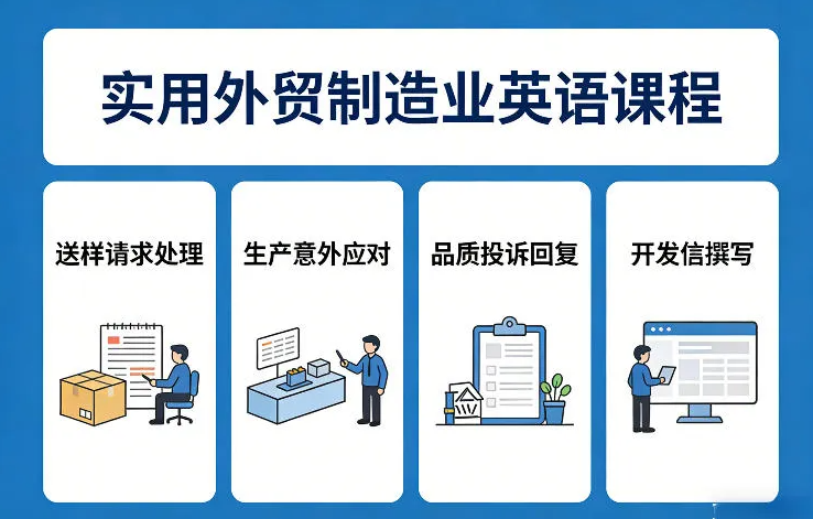 实用外贸制造业英语课程,教你专业处理送样请求、应对生产意外、回复品质投诉、撰写开发信等