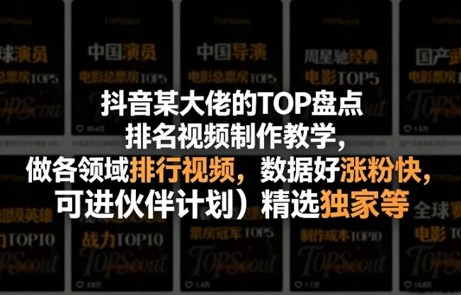 抖音某大佬的TOP盘点排名视频制作,做各领域排行视频,数据好涨粉快,可进伙伴计划+精选独家等