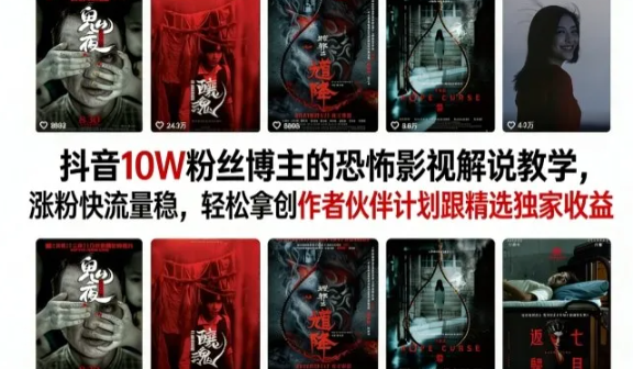 抖音10W粉丝博主的恐怖影视解说教学,涨粉快流量稳,轻松拿创作者伙伴计划跟精选独家收益