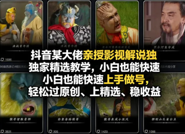 很多小白做影视解说,都陷入了一个误区:以为只要剪剪片段、配个音就够了,却忽略了抖音影视赛道的核心——独家技巧、原创方法、精选逻辑、变现闭环。市面上大多影视解说教程,要么太基础、没干货,要么没有实战支撑,更不教过原创、上精选的核心玩法,导致小白学完依旧不会做、做不好、賺不到钱。